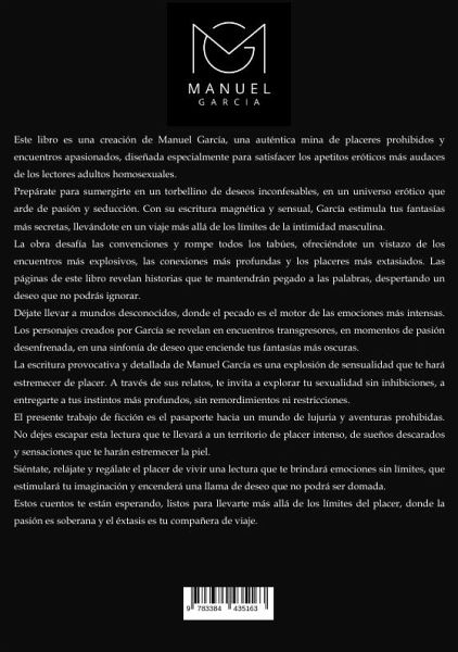 Este libro es una creación de Manuel García, una auténtica mina de placeres prohibidos y encuentros apasionados, diseñada especialmente para satisfacer los apetitos eróticos más audaces de los lectores adultos homosexuales.Prepárate para sumergirte en un torbellino de deseos inconfesables, en un universo erótico que arde de pasión y seducción. Con su escritura magnética y sensual, García estimula tus fantasías más secretas, llevándote en un viaje más allá de los límites de la intimidad masculina.La obra desafía las convenciones y rompe todos los tabúes, ofreciéndote un vistazo de los encuentros más explosivos, las conexiones más profundas y los placeres más extasiados. Las páginas de este libro revelan historias que te mantendrán pegado a las palabras, despertando un deseo que no podrás ignorar.Déjate llevar a mundos desconocidos, donde el pecado es el motor de las emociones más intensas. Los personajes creados por García se revelan en encuentros transgresores, en momentos de pasión desenfrenada, en una sinfonía de deseo que enciende tus fantasías más oscuras.La escritura provocativa y detallada de Manuel García es una explosión de sensualidad que te hará estremecer de placer. A través de sus relatos, te invita a explorar tu sexualidad sin inhibiciones, a entregarte a tus instintos más profundos, sin remordimientos ni restricciones.El presente trabajo de ficción es el pasaporte hacia un mundo de lujuria y aventuras prohibidas. No dejes escapar esta lectura que te llevará a un territorio de placer intenso, de sueños descarados y sensaciones que te harán estremecer la piel.Siéntate, relájate y regálate el placer de vivir una lectura que te brindará emociones sin límites, que estimulará tu imaginación y encenderá una llama de deseo que no podrá ser domada.Estos cuentos te están esperando, listos para llevarte más allá de los límites del placer, donde la pasión es soberana y el éxtasis es tu compañera de viaje.