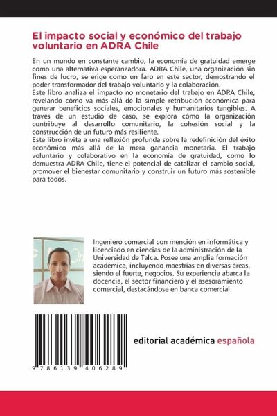 En un mundo en constante cambio, la economía de gratuidad emerge como una alternativa esperanzadora. ADRA Chile, una organización sin fines de lucro, se erige como un faro en este sector, demostrando el poder transformador del trabajo voluntario y la colaboración.Este libro analiza el impacto no monetario del trabajo en ADRA Chile, revelando cómo va más allá de la simple retribución económica para generar beneficios sociales, emocionales y humanitarios tangibles. A través de un estudio de caso, se explora cómo la organización contribuye al desarrollo comunitario, la cohesión social y la construcción de un futuro más resiliente.Este libro invita a una reflexión profunda sobre la redefinición del éxito económico más allá de la mera ganancia monetaria. El trabajo voluntario y colaborativo en la economía de gratuidad, como lo demuestra ADRA Chile, tiene el potencial de catalizar el cambio social, promover el bienestar comunitario y construir un futuro más sostenible para todos.
