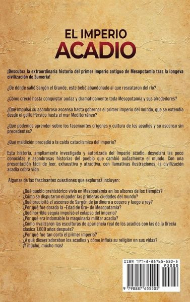 ¡Descubra la extraordinaria historia del primer imperio antiguo de Mesopotamia tras la longeva civilización de Sumeria! ¿De dónde salió Sargón el Grande, este bebé abandonado al que rescataron del río? ¿Cómo creció hasta conquistar audaz y dramáticamente toda Mesopotamia y sus alrededores? ¿Qué impulsó su asombroso ascenso hasta gobernar el primer imperio del mundo, que se extendía desde el golfo Pérsico hasta el mar Mediterráneo? ¿Qué podemos aprender sobre los fascinantes orígenes y cultura de los acadios y su ascenso sin precedentes? ¿Qué maldición precedió a la caída cataclísmica del imperio? Esta historia, ampliamente investigada y autorizada del Imperio acadio, desvelará las poco conocidas y asombrosas historias del pueblo que cambió audazmente el mundo. Con una presentación fácil de leer, exhaustiva y atractiva, con llamativas ilustraciones, la civilización acadia cobra vida. Algunas de las fascinantes cuestiones que explorará incluyen: ¿Qué pueblo prehistórico vivía en Mesopotamia en los albores de los tiempos? ¿Cómo se disputaron el poder las primeras ciudades del mundo? ¿Qué precipitó el ascenso de Sargón de jardinero a copero y luego a rey? ¿Por qué fue dorada la Edad de Oro de Mesopotamia? ¿Qué horrible sequía impulsó el colapso del imperio? ¿Por qué era indomable la maquinaria militar acadia? ¿Cómo rivalizaron las esculturas de apariencia real de los acadios con las de la Grecia clásica 1.600 años después? ¿Por qué fue tan corto el primer imperio? ¿A qué dioses adoraban los acadios y cómo influía su religión en sus vidas? ¡Y mucho, mucho más!