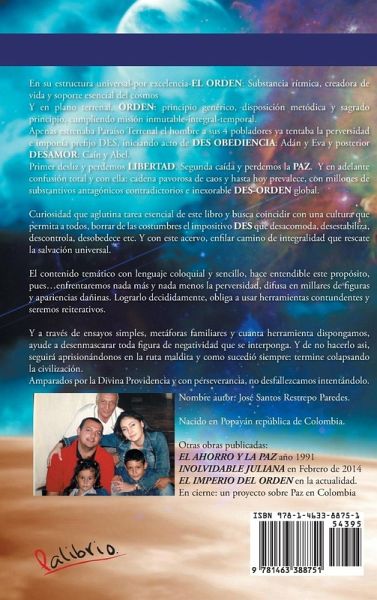 En su estructura universal-por excelencia-EL ORDEN: Substancia rítmica, creadora de vida y soporte esencial del cosmos Y en plano terrenal, ORDEN: principio genérico, disposición metódica y sagrado principio, cumpliendo misión inmutable-integral-temporal. Apenas estrenaba Paraíso Terrenal el hombre a sus 4 pobladores ya tentaba la perversidad e imponía prefi jo DES, iniciando acto de DES OBEDIENCIA: Adán y Eva y posterior DESAMOR: Caín y Abel. Primer desliz y perdemos LIBERTAD. Segunda caída y perdemos la PAZ. Y en adelante confusión total y con ella: cadena pavorosa de caos y hasta hoy prevalece, con millones de substantivos antagónicos contradictorios e inexorable DES-ORDEN global. Curiosidad que aglutina tarea esencial de este libro y busca coincidir con una cultura que permita a todos, borrar de las costumbres el impositivo DES que desacomoda, desestabiliza, descontrola, desobedece etc. Y con este acervo, enfi lar camino de integralidad que rescate la salvación universal. El contenido temático con lenguaje coloquial y sencillo, hace entendible este propósito, pues...enfrentaremos nada más y nada menos la perversidad, difusa en millares de fi guras y apariencias dañinas. Lograrlo decididamente, obliga a usar herramientas contundentes y seremos reiterativos. Y a través de ensayos simples, metáforas familiares y cuanta herramienta dispongamos, ayude a desenmascarar toda fi gura de negatividad que se interponga. Y de no hacerlo asi, seguirá aprisionándonos en la ruta maldita y como sucedió siempre: termine colapsando la civilización. Amparados por la Divina Providencia y con perseverancia, no desfallezcamos intentándolo.