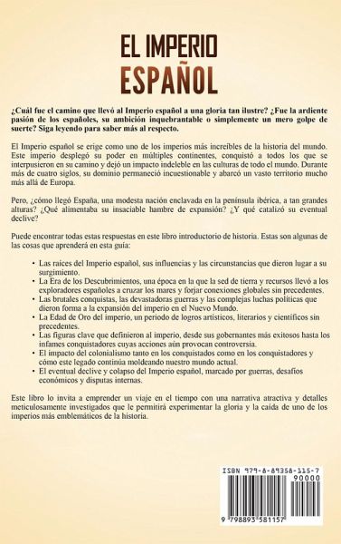 ¿Cuál fue el camino que llevó al Imperio español a una gloria tan ilustre? ¿Fue la ardiente pasión de los españoles, su ambición inquebrantable o simplemente un mero golpe de suerte? Siga leyendo para saber más al respecto. El Imperio español se erige como uno de los imperios más increíbles de la historia del mundo. Este imperio desplegó su poder en múltiples continentes, conquistó a todos los que se interpusieron en su camino y dejó un impacto indeleble en las culturas de todo el mundo. Durante más de cuatro siglos, su dominio permaneció incuestionable y abarcó un vasto territorio mucho más allá de Europa. Pero, ¿cómo llegó España, una modesta nación enclavada en la península ibérica, a tan grandes alturas? ¿Qué alimentaba su insaciable hambre de expansión? ¿Y qué catalizó su eventual declive? Puede encontrar todas estas respuestas en este libro introductorio de historia. Estas son algunas de las cosas que aprenderá en esta guía: Las raíces del Imperio español, sus influencias y las circunstancias que dieron lugar a su surgimiento. La Era de los Descubrimientos, una época en la que la sed de tierra y recursos llevó a los exploradores españoles a cruzar los mares y forjar conexiones globales sin precedentes. Las brutales conquistas, las devastadoras guerras y las complejas luchas políticas que dieron forma a la expansión del imperio en el Nuevo Mundo. La Edad de Oro del imperio, un periodo de logros artísticos, literarios y científicos sin precedentes. Las figuras clave que definieron al imperio, desde sus gobernantes más exitosos hasta los infames conquistadores cuyas acciones aún provocan controversia. El impacto del colonialismo tanto en los conquistados como en los conquistadores y cómo este legado continúa moldeando nuestro mundo actual. El eventual declive y colapso del Imperio español, marcado por guerras, desafíos económicos y disputas internas. Este libro lo invita a emprender un viaje en el tiempo con una narrativa atractiva y detalles meticulosamente investigados que le permitirá experimentar la gloria y la caída de uno de los imperios más emblemáticos de la historia.