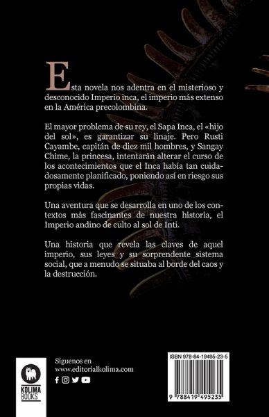 Esta novela nos adentra en el misterioso y desconocido Imperio inca, el más extenso en la América precolombina. El mayor problema de su rey, el Sapa Inca, el hijo del sol, es garantizar la continuación de su linaje. Pero Rusti Cayambe, capitán de diez mil hombres, y Sangay Chime, la princesa, intentarán alterar el curso de los acontecimientos que el Inca había cuidadosamente planificado, poniendo así en riesgo sus propias vidas. Una aventura que se desarrolla en uno de los contextos más fascinantes de nuestra historia, el Imperio andino de culto al sol de Inti. Esta novela revela las claves de aquel imperio, sus leyes y su sorprendente sistema social, a menudo al borde del caos y de la destrucción.