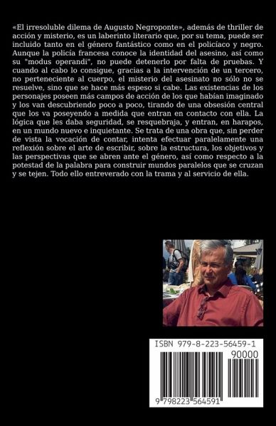 «El irresoluble dilema de Augusto Negroponte», además de thriller de acción y misterio, es un laberinto literario que, por su tema, puede ser incluido tanto en el género fantástico como en el policíaco y negro. Aunque la policía francesa conoce la identidad del asesino, así como su "modus operandi", no puede detenerlo por falta de pruebas. Y cuando al cabo lo consigue, gracias a la intervención de un tercero, no perteneciente al cuerpo, el misterio del asesinato no sólo no se resuelve, sino que se hace más espeso si cabe. La novela investiga el modo en que la palabra modela la conciencia y ésta la realidad. El espacio y el tiempo que le dan cohesión no pertenecen a la geometría euclidiana, sino que se acercan más a la mecánica cuántica y se rigen, en consecuencia, por otras leyes y otras correspondencias. Compartimentos que nos parecen estancos, en ella no lo son; antes al contrario, todo se halla conectado mediante vasos secretos. Las existencias de los personajes poseen más campos de acción de los que habían imaginado y los van descubriendo poco a poco, tirando de una obsesión central que los va poseyendo a medida que entran en contacto con ella. La lógica que les daba seguridad, se resquebraja, y entran, en harapos, en un mundo nuevo e inquietante. Se trata de una obra que, sin perder de vista la vocación de contar, intenta efectuar paralelamente una reflexión sobre el arte de escribir, sobre la estructura, los objetivos y las perspectivas que se abren ante el género, así como respecto a la potestad de la palabra para construir mundos paralelos que se cruzan y se tejen. Todo ello entreverado con la trama y al servicio de ella.