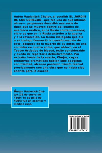 Antón Vaulvritch Chejov, al escribir EL JARDIN DE LOS CEREZOS-que fué una de sus últimas obras-, propúsose describir una serie de tipos que se mueven dentro del cuadro de una finca rústica, en la Rusia contemporánea; claro es que en la Rusia anterior a la guerra y a la revolución. La forma dialogada que dió a su trabajo favoreció la transformación de éste, después de la muerte de su autor, en una comedia en cuatro actos, que obtuvo, en el Teatro Artístico de Moscú, éxito considerable y quedó de repertorio definitivamente. Por extraña ironía de la suerte, Chejov, cuyas tentativas dramáticas habían sido acogidas con frialdad, alcanzó póstumo triunfo teatral precisamente con una obra que no había sido escrita para la escena.