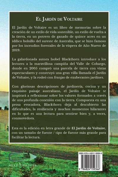 El Jardín de Voltaire es un libro de memorias sobre la creación de un estilo de vida sostenible, un estilo de vuelta a la tierra, en un potrero de ganado de quince acres en un idílico bolsillo del sureste de Australia, que se hizo famoso por los incendios forestales de la víspera de Año Nuevo de 2019. La galardonada autora Isobel Blackthorn introduce a los lectores a la maravillosa campiña del Valle de Cobargo, donde en 2005 compró una parcela de tierra con vistas espectaculares y construyó una gran villa llamada el Jardín de Voltaire, y la rodeó con franjas de exuberantes jardines. Con gloriosas descripciones de jardinería, cocina y un exquisito paisaje australiano, el Jardín de Voltaire te inspirará a reflexionar sobre los valores formados a través de una profunda conexión con la tierra. Compuesta en una prosa evocadora, Blackthorn deja al descubierto las dificultades, la resiliencia y muchos momentos hilarantes en lo que es una lectura para sentirse bien y, a veces, conmovedora. Esta es la edición en letra grande de El Jardín de Voltaire, con un tamaño de fuente / tipo de fuente más grande para facilitar la lectura.
