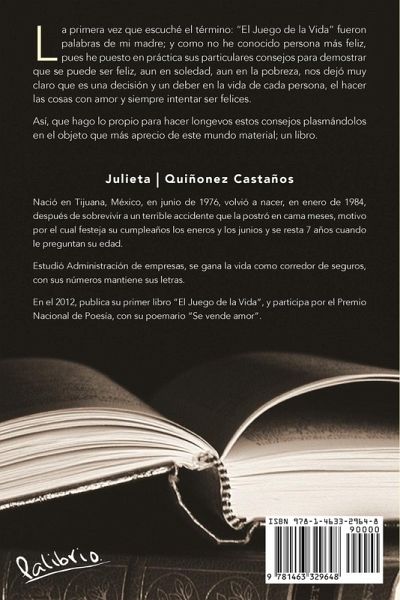 "La vida es un juego del que nadie puede en un momento retirarse llevándose sus ganancias." André Maurois (1885-1967). Novelista francés. Sin duda alguna, la primera vez que escuche la analogía de: "El juego de la vida" vino de palabras de mi madre; ella fue una mujer sabia, y no me refiero a ese conocimiento de aulas, no, ella poseía una sabiduría de vida, envidiable, era todo un personaje, es difícil describir toda la energía que irradiaba, parecía que nunca se cansaba, siempre se le veía de buen humor, siempre con una sonrisa, y créanme que no siempre la vida le sonreía, pero ella siempre le sonreía a la vida y a todos, creo que como yo la describo la describiría cualquiera que la conoció, es hermoso recoger de tantas de sus amistades bonitas palabras y el común denominador es " No sé cómo le hacía tu madre, pero siempre estaba de buenas , se le veía feliz, y siempre con una sonrisa "la gorda"... Como no he conocido persona más feliz que mi madre, pues he puesto en práctica sus particulares consejos y aun me deleita el vivir mi vida en apego a la forma que ella vivió y percibía el juego de la vida, como ella se refería al vivir la vida, Sin palabrería, solo con su ejemplo de vida, nos enseño a mi hermana y a mí, que se puede ser feliz, aun en soledad, aun en la pobreza, aun cuando el juego de la vida no te da buenos motivos, nos dejo muy claro que es una decisión y un deber en la vida de cada persona, el hacer las cosas con amor y siempre intentar ser felices. Así que quiero hacer lo propio para hacer longevos estos sabios consejos de vida y que mejor que dejar esto plasmado en el objeto que mas aprecio de este mundo material; un libro.