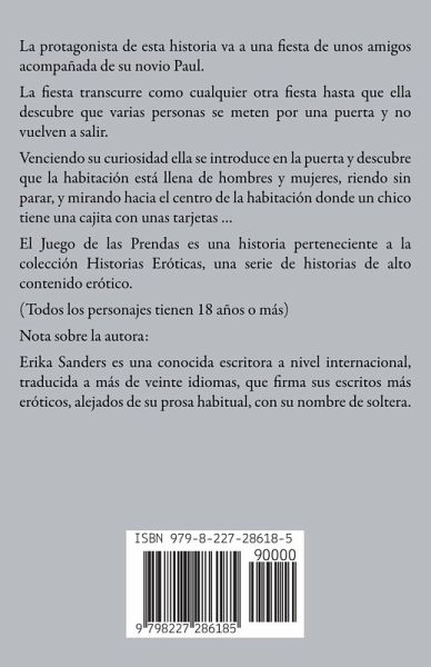 La protagonista de esta historia va a una fiesta de unos amigos acompañada de su novio Paul. La fiesta transcurre como cualquier otra fiesta hasta que ella descubre que varias personas se meten por una puerta y no vuelven a salir. Venciendo su curiosidad ella se introduce en la puerta y descubre que la habitación está llena de hombres y mujeres, riendo sin parar, y mirando hacia el centro de la habitación donde un chico tiene una cajita con unas tarjetas ... El Juego de las Prendas es una historia perteneciente a la colección Historias Eróticas, una serie de historias de alto contenido erótico. (Todos los personajes tienen 18 años o más) Nota sobre la autora: Erika Sanders es una conocida escritora a nivel internacional, traducida a más de veinte idiomas, que firma sus escritos más eróticos, alejados de su prosa habitual, con su nombre de soltera.
