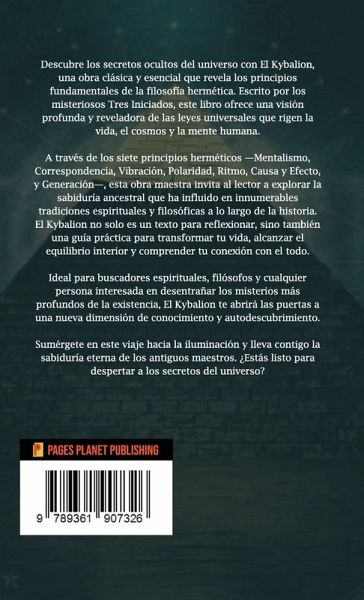 Descubre los secretos ocultos del universo con El Kybalion, una obra clásica y esencial que revela los principios fundamentales de la filosofía hermética. Escrito por los misteriosos Tres Iniciados, este libro ofrece una visión profunda y reveladora de las leyes universales que rigen la vida, el cosmos y la mente humana. A través de los siete principios herméticos -Mentalismo, Correspondencia, Vibración, Polaridad, Ritmo, Causa y Efecto, y Generación-, esta obra maestra invita al lector a explorar la sabiduría ancestral que ha influido en innumerables tradiciones espirituales y filosóficas a lo largo de la historia. El Kybalion no solo es un texto para reflexionar, sino también una guía práctica para transformar tu vida, alcanzar el equilibrio interior y comprender tu conexión con el todo. Ideal para buscadores espirituales, filósofos y cualquier persona interesada en desentrañar los misterios más profundos de la existencia, El Kybalion te abrirá las puertas a una nueva dimensión de conocimiento y autodescubrimiento. Sumérgete en este viaje hacia la iluminación y lleva contigo la sabiduría eterna de los antiguos maestros. ¿Estás listo para despertar a los secretos del universo?
