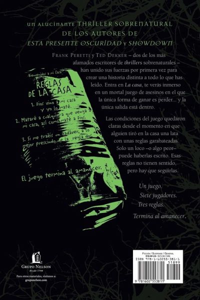 La casa: La ¿¿nica manera de salir est¿¿ dentro es un thriller emocionante y adictivo, que te tendr¿¿ en suspenso desde sus primeras p¿¿ginas. La historia se centra en 4 personajes principales, un matrimonio y una pareja de novios que se ven obligados a hospedarse en una casa en medio de la nada. Las cosas se vuelven espeluznantes cuando se enteran que est¿¿n encerrados con otros 3 desconocidos en medio de un juego mortal con 3 reglas principales, entre ellas: entregar un cad¿¿ver antes del amanecer o todos morir¿¿n. Los autores Frank Peretti (uno de los escritores de literatura cristiana m¿¿s le¿¿dos del mundo) y Ted Dekker (escritor de bestsellers cristianos del New York Times), crearon esta historia llena de adrenalina y confrontaciones entre el bien y el mal. Incluye: Novela ficticia cristiana. Frank Peretti y Ted Dekker, dos de los escritores m¿¿s reconocidos en novelas de ficci¿¿n. Un alucinante thriller sobrenatural donde los personajes se encuentran cara a cara con el pecado. House House is an exciting and addictive thriller that will have you in suspense from its first pages. The story focuses on 4 main characters, a married couple, and a boyfriend and girlfriend, who are forced to stay in a house in the middle of nowhere. Things get spooky when they find out they are locked in with 3 other strangers in the middle of a deadly game with 3 main rules including: deliver a corpse before dawn or they will all die. Authors Frank Peretti (one of the world's most widely read Christian literature writers) and Ted Dekker (New York Times Christian bestselling writer) created this adrenaline-fueled story of confrontations between good and evil. It includes: Christian fictional novel. Frank Peretti and Ted Dekker, two of the most recognized writers in fiction novels. A mind-blowing supernatural thriller where the characters come face to face with sin.