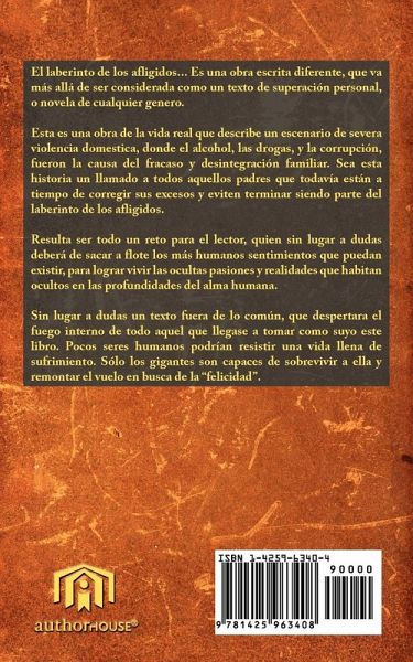 El laberinto de los afligidos... Es una obra escrita diferente, que va más allá de ser considerada como un texto de superación personal, o novela de cualquier genero. Esta es una obra de la vida real que describe un escenario de severa violencia domestica, donde el alcohol, las drogas, y la corrupción, fueron la causa del fracaso y desintegración familiar. Sea esta historia un llamado a todos aquellos padres que todavía están a tiempo de corregir sus excesos y eviten terminar siendo parte del laberinto de los afligidos. Resulta ser todo un reto para el lector, quien sin lugar a dudas deberá de sacar a flote los más humanos sentimientos que puedan existir, para lograr vivir las ocultas pasiones y realidades que habitan ocultos en las profundidades del alma humana. Sin lugar a dudas un texto fuera de lo común, que despertara el fuego interno de todo aquel que llegase a tomar como suyo este libro. Pocos seres humanos podrían resistir una vida llena de sufrimiento. Sólo los gigantes son capaces de sobrevivir a ella y remontar el vuelo en busca de la "felicidad".