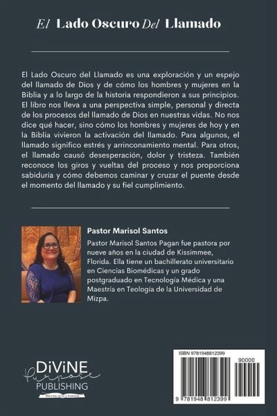 El Lado Oscuro del Llamado es una exploración y un espejo del llamado de Dios y de cómo los hombres y mujeres en la Biblia y a lo largo de la historia respondieron a sus principios. El libro nos lleva a una perspectiva simple, personal y directa de los procesos del llamado de Dios en nuestras vidas. No nos dice qué hacer, sino cómo los hombres y mujeres de hoy y en la Biblia vivieron la activación del llamado. Para algunos, el llamado significo estrés y arrinconamiento mental. Para otros, el llamado causó desesperación, dolor y tristeza. También reconoce los giros y vueltas del proceso y nos proporciona sabiduría y cómo debemos caminar y cruzar el puente desde el momento del llamado y su fiel cumplimiento.