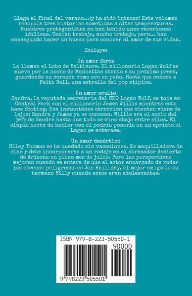 Llega el final del verano...¡y ha sido intenso! Este volumen recopila tres historias sometidas a altas temperaturas. Nuestros protagonistas no han tenido unas vacaciones idílicas. Tenían trabajo, mucho trabajo, pero... han conseguido hacer un hueco para conocer al amor de sus vidas. Incluye: Un amor feroz Lo llaman el Lobo de Baltimore. El millonario Logan Wolf se mueve por la noche de Manhattan atento a su próxima presa, guardando su corazón como oro en paño. Hasta que conoce a Faith Bell, una estrella del pop atípica. Un amor oculto Sandra, la reputada secretaria del CEO Logan Wolf, se topa en Central Park con el millonario James Willis mientras este hace footing. Esa instantánea atracción que sienten viene de lejos: Sandra y James ya se conocen. Willis era el socio del jefe de Sandra hasta que todo se vino abajo entre ellos. El simple hecho de hablar con él podría ponerla en un aprieto si Logan se enterase. Un amor desértico Riley Thomas se ha quedado sin vacaciones. Es maquilladora de cine y debe incorporarse a un rodaje en el abrasador desierto de Arizona en pleno mes de julio. Pero las perspectivas mejoran cuando se entera de que el actor encargado de rodar las escenas peligrosas es Jon Halliday, el mejor amigo de su hermano Billy cuando estos eran adolescentes.