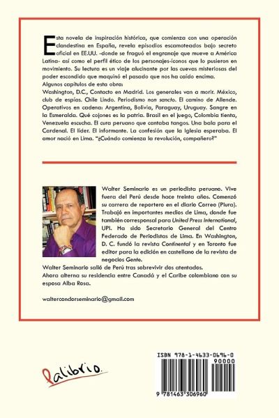 Esta novela de inspiración histórica, que comienza con una operación clandestina en España, revela episodios escamoteados bajo secreto oficial en EE.UU, donde se fraguó el engranaje que mueve a América Latina, así como el perfil ético de los personajes-íconos que lo pusieron en movimiento. Su lectura es un viaje alucinante por las cuevas misteriosas del poder escondido que maquinó el pasado que nos ha caído encima. Estos son algunos capítulos que componen esta obra: Washington, D.C., Contacto en Madrid. Los generales van a morir. México, club de espías. Chile lindo. El camino de Allende. Operativos en cadena: Argentina, Bolivia, Paraguay, Uruguay. Sangre en la Esmeralda. Qué cojones es la patria. Brasil en el juego, Colombia tienta, Venezuela escucha. El cura peruano que cantaba tangos. Una bala para el Cardenal. El líder. El informante. La confesión que la Iglesia esperaba. El amor nació en Lima. "¿Cuándo comienza la revolución, compañero?"