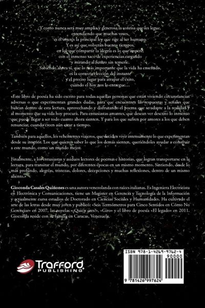 Este libro de poesía ha sido escrito para todas aquellas personas que están viviendo circunstancias adversas o que experimentan grandes dudas. Para que encuentren las respuestas y señales que buscan dentro de esta lectura, aprovechando y disfrutando el poema que se adapte a la realidad y al momento que su vida hoy procura. Para entusiastas amantes, que desean ver descrito lo inmenso que puede llegar a ser todo cuanto ahora sienten. Y para los que sufren por amores a los que deben renunciar, cuando creen aún estar a tiempo. También para aquellos, los vehementes viajeros, que deciden vivir intensamente lo que experimentan desde su interior. Los que quieren saber, lo que los demás sienten, queriéndoles ayudar a percibir y construir a este mundo, como un mundo mejor. Finalmente, a los entusiastas y asiduos lectores de poemas e historias, que logran transportarse en la lectura, para transitar el mundo, por diferentes épocas en un mismo momento. Sintiendo, desde lo más profundo, alegrías, tristezas, dolores, decepciones y muchas reflexiones, dentro de un mismo aliento.