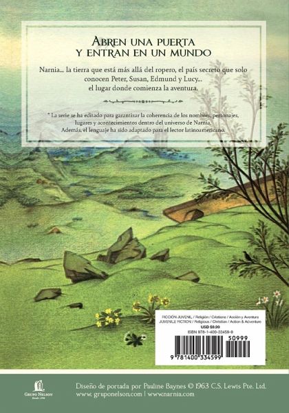 NARNIA... la tierra que est�� m��s all�� del ropero, el pa��s secreto que solo conocen Peter, Susan, Edmund y Lucy... el lugar donde comienza la aventura. Lucy es la primera en encontrar el secreto del ropero en la vieja y misteriosa casa del profesor. Al principio, nadie le cree cuando cuenta sus aventuras en el pa��s de Narnia. Sin embargo, pronto Edmund y luego Peter y Susan descubren la magia y conocen por s�� mismos a Aslan, el Gran Le��n. En un abrir y cerrar de ojos, su vida cambia para siempre. Por primera vez, el lenguaje de los siete libros cl��sicos ha sido adaptado para el lector latinoamericano y editado para garantizar la coherencia de los nombres, personajes, lugares y acontecimientos dentro del universo de Narnia. Adem��s, presentan las cubiertas e ilustraciones originales de Pauline Barnes. Aunque forma parte de una saga, este es un libro independiente. Si quieres descubrir m��s sobre Narnia, puedes leer El caballo y su muchacho, el tercer libro de Las cr��nicas de Narnia. The Lion, The Witch and the Wardrobe NARNIA... the land beyond the wardrobe, the secret country that only Peter, Susan, Edmund and Lucy know... the place where adventure begins. Lucy is the first to find the secret of the closet in the Professor's mysterious old house. At first, no one believes her when she tells of her adventures in the land of Narnia. Soon, however, Edmund and then Peter and Susan discover the magic and meet Aslan, the Great Lion, for themselves. In the blink of an eye, their lives change forever. For the first time, the language of the seven classic books has been adapted for the Latin American reader and edited to ensure consistency of names, characters, places and events within the Narnia universe. In addition, they feature the original covers and illustrations by Pauline Barnes. Although it is part of a saga, this is a stand-alone book. If you want to discover more about Narnia, you can read The Horse and His Boy, the third book of The Chronicles of Narnia.
