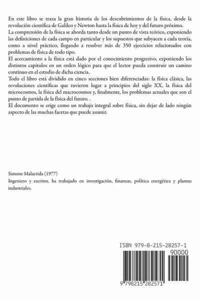 En este libro se traza la gran historia de los descubrimientos de la física, desde la revolución científica de Galileo y Newton hasta la física de hoy y del futuro próximo. La comprensión de la física se aborda tanto desde un punto de vista teórico, exponiendo las definiciones de cada campo en particular y los supuestos que subyacen a cada teoría, como a nivel práctico, llegando a resolver más de 350 ejercicios relacionados con problemas de física de todo tipo. El acercamiento a la física está dado por el conocimiento progresivo, exponiendo los distintos capítulos en un orden lógico para que el lector pueda construir un camino continuo en el estudio de dicha ciencia. Todo el libro está dividido en cinco secciones bien diferenciadas: la física clásica, las revoluciones científicas que tuvieron lugar a principios del siglo XX, la física del microcosmos, la física del macrocosmos y, finalmente, los problemas actuales que son el punto de partida de la física del futuro. . El documento se erige como un trabajo integral sobre física, sin dejar de lado ningún aspecto de las muchas facetas que puede asumir.