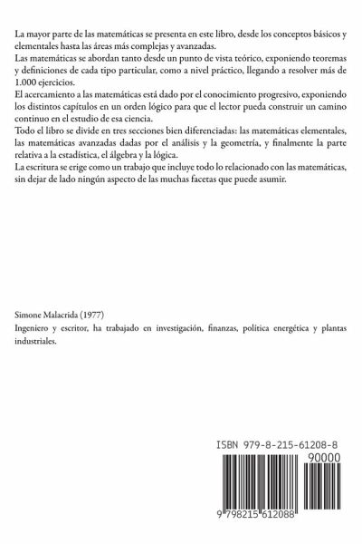La mayor parte de las matemáticas se presenta en este libro, desde los conceptos básicos y elementales hasta las áreas más complejas y avanzadas. Las matemáticas se abordan tanto desde un punto de vista teórico, exponiendo teoremas y definiciones de cada tipo particular, como a nivel práctico, llegando a resolver más de 1.000 ejercicios. El acercamiento a las matemáticas está dado por el conocimiento progresivo, exponiendo los distintos capítulos en un orden lógico para que el lector pueda construir un camino continuo en el estudio de esa ciencia. Todo el libro se divide en tres secciones bien diferenciadas: las matemáticas elementales, las matemáticas avanzadas dadas por el análisis y la geometría, y finalmente la parte relativa a la estadística, el álgebra y la lógica. La escritura se erige como un trabajo que incluye todo lo relacionado con las matemáticas, sin dejar de lado ningún aspecto de las muchas facetas que puede asumir.