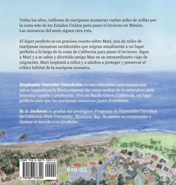 Todos los años, millones de mariposas monarcas vuelan miles de millas por la costa este de los Estados Unidos para pasar el invierno en México. Las monarcas del oeste siguen otra ruta. El lugar perfecto es un gracioso cuento sobre Mari, una de miles de mariposas monarcas occidentales que migran anualmente a un lugar perfecto a lo largo de la costa de California para pasar el invierno. Sigue a Mari y a su sabio y divertido amigo Max en su extraordinario viaje de migración. Mari inspirará a niños y a adultos a proteger y preservar el crítico hábitat de la mariposa monarca.