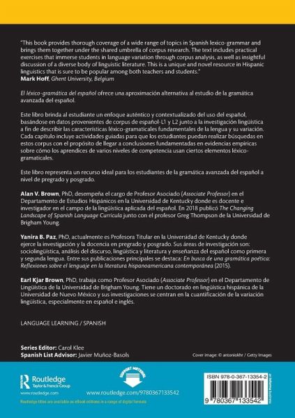 Drawing on L1 and L2 Spanish language corpora and linguistic research to describe key lexico-grammatical characteristics of the Spanish language, this book gives students insight into real, variable, and contextualized usage of Spanish. Each chapter includes guided exercises so that students can conduct their own searches of the corpus and draw evidence-based conclusions on how particular grammar structures are used by Spanish speakers at varying levels of proficiency.