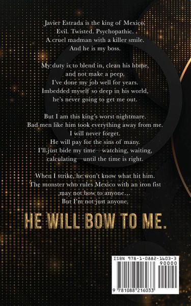 Javier Estrada is the king of Mexico. Evil. Twisted. Psychopathic. A cruel madman with a killer smile. And he is my boss. My duty is to blend in, clean his home, and not make a peep. I've done my job well for years. Imbedded myself so deep in his world, he's never going to get me out. But I am this king's worst nightmare. Bad men like him took everything away from me. I will never forget. He will pay for the sins of many. I'll just bide my time-watching, waiting, calculating-until the time is right. When I strike, he won't know what hit him. The monster who rules Mexico with an iron fist may not bow to anyone... But I'm not just anyone. He will bow to me. This book is a dark mafia romance. There are many triggers in this book including violence both physical and sexual. Reader discretion is advised.