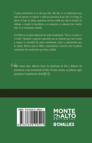 El quinto mandamiento no es solo para niños. Más bien, es un mandamiento para todas las personas sin importar su edad que permanece de por vida. En el hogar, la iglesia y el lugar de trabajo, proporciona una base estable para toda la sociedad. Sin embargo, a menudo lo descuidamos y no apreciamos su relevancia para nuestras vidas. Es el mandamiento olvidado. Este folleto es una breve exploración del quinto mandamiento: "Honra a tu padre y a tu madre". Responde a preguntas importantes que son relevantes para todo cristiano y recupera la centralidad del quinto mandamiento, incluso y especialmente para los adultos. Miremos juntos la Biblia y especialmente a Jesucristo como el perfecto cumplimiento del mandamiento que hemos olvidado.
