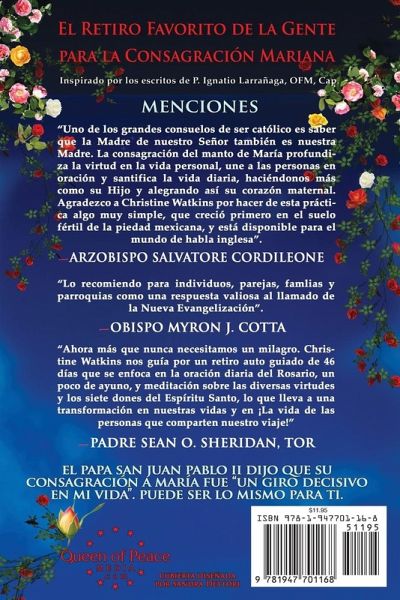 Esta es una Consagración Mariana que la gente no quiere que termine. El resultado de este retiro autoguiado son milagros de sanación, reconciliación de familias y conversiones a la iglesia. El Manto de María: Una Consagración Mariana para Obtener Ayuda Celestial, que está recomendado por el Arzobispo Salvatore Cordileone y el Obispo Myron J. Cotta, ofrece una lluvia de gracias sobre tu vida y tus seres queridos. San Juan Pablo II dijo que su consagración a María fue "un momento decisivo en mi vida". Puede ser lo mismo para ti. El Manto de Maria: Una Consagración Mariana para Obtener Ayuda Celestial nos llega en momentos tempestuosos. Es muy importante que nos consagremos hoy a la Madre de Dios - confiando nuestra vida a su protección, guía y cuidado, e invitándola a conformarnos a la semejanza de su Hijo. En estos días hay tanta necesidad y desolación en el mundo, en la Iglesia, en nuestras familias y en nuestros corazones. Al prepararnos para la consagración a través del poder del Rosario, un poco de ayuno y una lectura de dos minutos de una hermosa meditación diaria sobre una virtud o don del Espíritu Santo (la parte favorita de la gente), podemos realmente esperar la ayuda del cielo. Este retiro es perfecto para personas, parejas, familias, grupos y parroquias. Para profundizar aún más en las gracias de Dios, un libro de trabajo complementario, El Diario de Oración para la Consagración con El Manto de María, también ofrece citas de santos, pasajes de las Escrituras y preguntas perspicaces para la reflexión. ¿Estás dispuesto a hacer tu parte y darle una oportunidad a Dios?