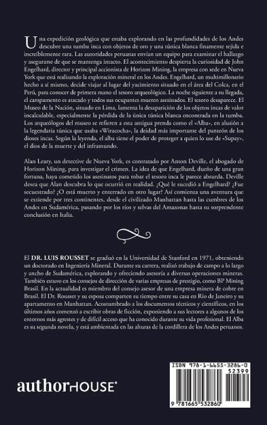 Una expedición geológica que estaba explorando en las profundidades de los Andes descubre una tumba inca con objetos de oro y una túnica blanca finamente tejida e increíblemente rara. Las autoridades peruanas envían un equipo para examinar el hallazgo y asegurarse de que se mantenga intacto. El acontecimiento despierta la curiosidad de John Engelhard, director y principal accionista de Horizon Mining, la empresa con sede en Nueva York que está realizando la exploración mineral en los Andes. Engelhard, un multimillonario hecho a sí mismo, decide viajar al lugar del yacimiento situado en el área del Colca, en el Perú, para conocer de primera mano el tesoro arqueológico. La noche siguiente a su llegada, el campamento es atacado y todos sus ocupantes mueren asesinados. El tesoro desaparece. El Museo de la Nación, situado en Lima, lamenta la desaparición de los objetos incas de valor incalculable, especialmente la pérdida de la única túnica blanca encontrada en la tumba. Los arqueólogos del museo se refieren a esta antigua prenda como el Alba, en alusión a la legendaria túnica que usaba Wiracocha, la deidad más importante del panteón de los dioses incas. Según la leyenda, el alba tiene el poder de proteger a quien lo use de Supay, el dios de la muerte y del inframundo. Alan Leary, un detective de Nueva York, es contratado por Anton Deville, el abogado de Horizon Mining, para investigar el crimen. La idea de que Engelhard, dueño de una gran fortuna, haya cometido los asesinatos para robar el tesoro inca le parece absurda. Deville desea que Alan descubra lo que ocurrió en realidad. ¿Qué le sucedió a Engelhard? ¿Fue secuestrado? ¿O está muerto y enterrado en otro lugar? Así comienza una aventura que se extiende por tres continentes, desde el civilizado Manhattan hasta las cumbres de los Andes en Sudamérica, pasando por los ríos y selvas del Amazonas hasta su sorprendente conclusión en Italia.