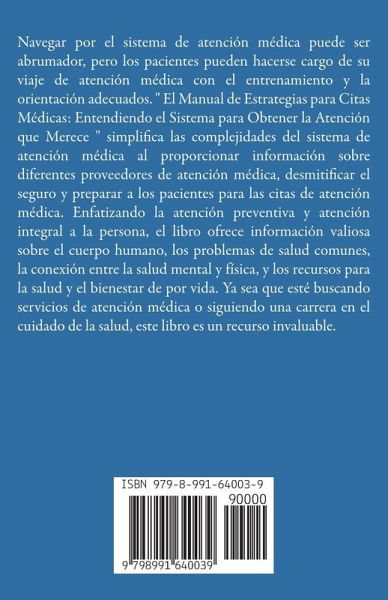 Navegar por el sistema de atención médica puede ser abrumador, pero los pacientes pueden hacerse cargo de su viaje de atención médica con el entrenamiento y la orientación adecuados. " El Manual de Estrategias para Citas Médicas: Entendiendo el Sistema para Obtener la Atención que Merece " simplifica las complejidades del sistema de atención médica al proporcionar información sobre diferentes proveedores de atención médica, desmitificar el seguro y preparar a los pacientes para las citas de atención médica. Enfatizando la atención preventiva y atención integral a la persona, el libro ofrece información valiosa sobre el cuerpo humano, los problemas de salud comunes, la conexión entre la salud mental y física, y los recursos para la salud y el bienestar de por vida. Ya sea que esté buscando servicios de atención médica o siguiendo una carrera en el cuidado de la salud, este libro es un recurso invaluable.
