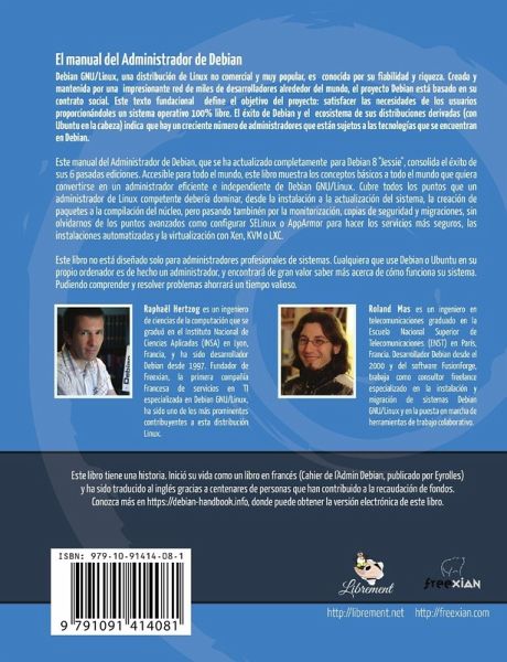 Debian GNU/Linux, una distribución de Linux no comercial y muy popular, es conocida por su fiabilidad y riqueza. Este manual del Administrador de Debian, que se ha actualizado completamente para Debian 8 "Jessie", consolida el éxito de sus 6 pasadas ediciones. Accesible para todo el mundo, este libro muestra los conceptos básicos a todo el mundo que quiera convertirse en un administrador eficiente e independiente de Debian GNU/Linux. Cubre todos los puntos que un administrador de Linux competente debería dominar, desde la instalación a la actualización del sistema, la creación de paquetes a la compilación del núcleo, pero pasando tambinén por la monitorización, copias de seguridad y migraciones, sin olvidarnos de los puntos avanzados como configurar SELinux o AppArmor para hacer los servicios más seguros, las instalaciones automatizadas y la virtualización con Xen, KVM o LXC. https://debian-handbook.info