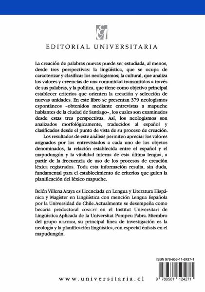 La creaci n de palabras nuevas puede ser estudiada, al menos, desde tres perspectivas: la ling stica, que se ocupa de caracterizar y clasificar los neologismos; la cultural, que analiza los valores y creencias de una comunidad transmitidos a trav s de sus palabras, y la pol tica, que tiene como objetivo principal establecer criterios que orienten la creaci n y selecci n de nuevas unidades. En este libro se presentan 379 neologismos espont neos obtenidos mediante entrevistas a mapuche hablantes de la ciudad de Santiago, los cuales son examinados desde estas tres perspectivas. As, los neologismos son analizados morfol gicamente, traducidos al espa ol y clasificados desde el punto de vista de su proceso de creaci n. Los resultados de este an lisis permiten apreciar los valores asignados por los entrevistados a cada uno de los objetos denominados, la relaci n establecida entre el espa ol y el mapudung n y la vitalidad interna de esta ltima lengua, a partir de la frecuencia de uso de los procesos de creaci n l xica registrados. Toda esta informaci n resulta, sin duda, fundamental para el establecimiento de criterios que gu en la planificaci n del l xico mapuche.