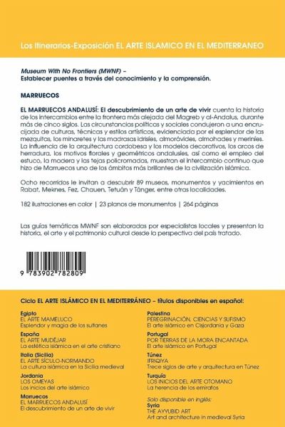 El descubrimiento de un arte de vivir cuenta la historia de los intercambios entre la frontera más alejada del Magreb y al-Andalus, durante más de cinco siglos. Las circunstancias políticas y sociales condujeron a una encrucijada de culturas, técnicas y estilos artísticos, evidenciada por el esplendor de las mezquitas, los minaretes y las madrasas idrisíes, almorávides, almohades y meriníes. La influencia de la arquitectura cordobesa y los modelos decorativos, los arcos de herradura, los motivos florales y geométricos andalusíes, así como el empleo del estuco, la madera y las tejas policromadas, muestran el intercambio continuo que hizo de Marruecos uno de los ámbitos más brillantes de la civilización islámica. Ocho recorridos le invitan a descubrir 89 museos, monumentos y yacimientos en Rabat, Meknes, Fez, Chauen, Tetuán y Tánger, entre otras localidades. Esta obra forma parte de la colección "El arte islámico en el Mediterráneo". Cada título de esta colección tiene una introducción general idéntica para todos los títulos, seguida de una introducción específica al título en cuestión. Para la versión eBook / Kindle: el enlace "Echa un vistazo / Look inside" le da acceso a la tabla de contenido de este título y a una parte de su introducción específica. Para la versión de bolsillo: el enlace "Echa un vistazo/Look Inside" da acceso a la introducción general. Nota: el libro electrónico incluye un índice de nombres de lugares. Busca otros títulos de esta serie disponibles en español o inglés con ‘El arte islámico en el Mediterráneo + MWNF (nueve títulos)’ o ‘Islamic art in the Mediterranean + MWNF’ (diez títulos). Busca todos los títulos de Museum With No Frontiers en todos los idiomas con ‘Museum With No Frontiers + MWNF’.