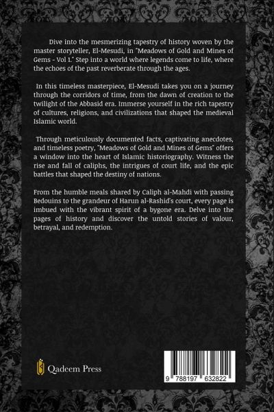 Enter the captivating world of Meadows of Gold and Mines of Gems - Vol 1, where history comes alive in the hands of master storyteller El-Mesudi. Through vivid prose and evocative imagery, El-Mesudi weaves a mesmerizing tapestry that transports readers to the heart of the medieval Islamic era. Journey through time as El-Mesudi guides you through the corridors of history, from the dawn of creation to the twilight of the Abbasid era. With meticulous detail and unparalleled storytelling, Meadows of Gold and Mines of Gems - Vol 1 offers a glimpse into the rich tapestry of cultures, religions, and civilizations that shaped the medieval Islamic world. Immerse yourself in the drama of court life, the epic battles that shaped nations, and the untold stories of valor and betrayal. From the humble meals shared by caliphs to the opulence of royal courts, each page is infused with the vibrant spirit of a bygone era, inviting readers to lose themselves in the wonders of the past. But Meadows of Gold and Mines of Gems - Vol 1 is more than just a history book; it's an invitation to embark on an extraordinary adventure. Whether you're a seasoned scholar or a curious novice, El-Mesudi's masterful storytelling is sure to captivate your imagination and ignite your thirst for knowledge. Don't miss your chance to experience the magic of Meadows of Gold and Mines of Gems - Vol 1. Step into a world where legends come to life, and history unfolds before your eyes. Your journey through the annals of time awaits within the pages of this timeless masterpiece. Table of Contents:Introduction: The Legacy of Al-Masudi In the Beginning: Creation and Early Civilizations The Rise of Islam: From Prophet Muhammad to the Early Caliphates The Abbasid Era: Glories and Turmoil The Caliphs: Guardians of Power and Prestige Courtly Intrigues: Secrets of the Royal Palaces From Baghdad to Cordoba: Trade, Travel, and Cultural Exchange Unveiling the Unknown: Tales of Exploration and Discovery Epilogue: Echoes of the Past, Lessons for the Future
