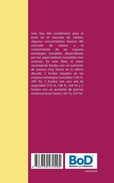 Solo hay dos condiciones para el éxito en el mercado de valores: algunos conocimientos básicos del mercado de valores y el conocimiento de las mejores estrategias bursátiles desarrolladas por los especuladores bursátiles más exitosos. En este libro, el autor recomienda fondos con un aumento de precios muy fuerte en la última década: 2 fondos basados en las mejores estrategias bursátiles ( 130 %, 209 % ), 3 fondos con una red de seguridad ( 116 %, 128 %, 164 % ) y 2 fondos con un aumento de precios extremamente fuerte ( 301 %, 535 % ).