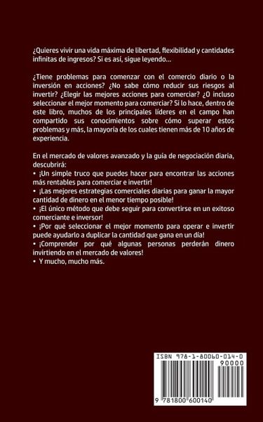 ¿Quieres vivir una vida máxima de libertad, flexibilidad y cantidades infinitas de ingresos? Si es así, sigue leyendo ... ¿Tiene problemas para comenzar con el comercio diario o la inversión en acciones? ¿No sabe cómo reducir sus riesgos al invertir? ¿Elegir las mejores acciones para comerciar? ¿O incluso seleccionar el mejor momento para comerciar? Si lo hace, dentro de este libro, muchos de los principales líderes en el campo han compartido sus conocimientos sobre cómo superar estos problemas y más, la mayoría de los cuales tienen más de 10 años de experiencia. En el mercado de valores avanzado y la guía de negociación diaria, descubrirá: • ¡Un simple truco que puedes hacer para encontrar las acciones más rentables para comerciar e invertir! • ¡Las mejores estrategias comerciales diarias para ganar la mayor cantidad de dinero en el menor tiempo posible! • ¡El único método que debe seguir para convertirse en un exitoso comerciante e inversor! • ¡Por qué seleccionar el mejor momento para operar e invertir puede ayudarlo a duplicar la cantidad que gana en un día! • ¡Comprender por qué algunas personas perderán dinero invirtiendo en el mercado de valores! • Y mucho, mucho más. Los métodos y conocimientos probados son muy fáciles de seguir. Incluso si nunca antes ha intentado negociar e invertir en acciones, podrá alcanzar un alto nivel de éxito. Por lo tanto, si no desea transformar su cuenta bancaria, sino revolucionar su vida, haga clic en "Agregar al carrito" en la esquina superior derecha AHORA.