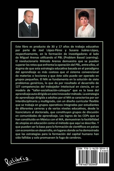 Miguel Arenas Vargas, creador del método educativo que lleva su nombre, nació en la ciudad de México, Distrito Federal, el 14 de julio de 1940. Ha dedicado su vida a la formación de científicos independientes en pequeñas comunidades esparcidas en la periferia de la república mexicana a partir del reconocimiento que la sociedad mexicana, así como la de muchos países con economías en desarrollo necesitan de científicos para poder acceder a mejores condiciones de vida para sus habitantes. Al tratar de responder la pregunta: ¿Cómo aprende el hombre?, propone una revolución en la educación para la salud humana, la salud animal y el aprovechamiento de los recursos naturales, mediante innovaciones educativas que centran al estudiante en el aprendizaje autödirigido y en la investigación como método de estudio. Este libro es producto de 30 años de trabajo pedagógico por parte de Joel López-Pérez y y17 años de inmersión en la innovación educativa por parte de Susana Juárez-López, ambos comprometidos con la formación de investigadores al lado de Miguel Arenas. El Método Arenas (MA) utiliza las estrategias del PBL (Problem Based Learning) ligado a otras técnicas de aprendizaje grupales, como los grupos operativos de Pichón Riviere, y las Comunidades de Práctica (COPs) ampliamente estudiadas por Jean Lave y Etienne Wenger desde la última década del siglo XX, para hacer de las reuniones de discusión una experiencia óptima que fluye para hacer consciente el inconsciente y generar cambios en la mente de los participantes. El componente educativo fundamental de este revolucionario método es el acto consciente, ya que las cosas adquieren importancia para nosotros cuando somos conscientes de su existencia, que es el pensamiento central en los grupos que han adoptado las formas de preceder propuestas por Miguel Arenas.
