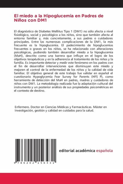 El diagnóstico de Diabetes Mellitus Tipo 1 (DM1) no sólo afecta a nivel fisiológico, social y psicológico a los niños, sino que también afecta al entorno familiar y, más concretamente, a sus padres o cuidadores principales. Entre las numerosas complicaciones de la DM1, la más frecuente es la hipoglucemia. El padecimiento de hipoglucemias frecuentes o graves en los niños, se ha relacionado con alteraciones psicológicas, pudiendo también desarrollar miedo a la hipoglucemia (MaH), descrito como una barrera que influye en el logro de los objetivos terapéuticos y en la adherencia al tratamiento de los niños y la familia. Es importante detectar y medir este fenómeno en los padres con el fin de desarrollar intervenciones que disminuyan este miedo y mejoren el control de la enfermedad de los niños y la calidad de vida familiar. El objetivo general de este trabajo fue validar en español el cuestionario Hypoglycemia Fear Survey for Parents (HFS P), como herramienta de detección del MaH en padres, madres y cuidadores de niños con DM1. La metodología realizada fue la adaptación cultural del instrumento y un posterior análisis de sus propiedades psicométricas en el contexto de destino.