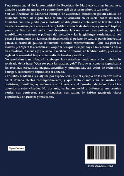 Para contrastes, el de la comunidad de Recoletas de Marineda con su hermanuco, donado o sacristán, que no sé a punto cierto cuál de estos nombres le cae mejor. Son las Recoletas de Marineda ejemplo de austeridad monástica; gastan camisa de estameña; comen de vigilia todo el año; se acuestan en el suelo, sobre las losas húmedas, con una piedra por almohada; se disciplinan cruelmente; se levantan a las tres de la mañana para orar en el coro; hablan al través de doble reja y un velo tupido; para consultar con el médico no descubren la cara, y son tan pobres, que los republicanos carniceros o polleros del mercado y las lengüilargas verduleras, al ver pasar al hermanuco con la cesta, deslizan en ella el pedazo de vaca, el par de huevos, la patata, el cuarto de gallina, el torrezno, diciendo expresivamente: "Que sea para las madres, ¿eh?; para las enfermas." Porque saben que siempre hay en la enfermería dos o tres recoletas, lo menos, y que si no lo reciben de limosna, no tendrían caldo, pues ni la regla ni la necesidad les permiten salir de bacalao y sardina. No quedaban tranquilas, sin embargo, las caritativas verduleras, y lo probaba lo recalcado de la frase: "Que sea para las madres, ¿eh?" Porque así como se figuraban a las recoletas escuálidas, magras, amarillas y puntiagudas, así veían de rechoncho, barrigón, coloradote y enjundioso al donado. Constábales, además -y a alguna por experiencia-, que el ejemplo de las madres surtía en el donado efectos contraproducentes, y que tanto cuanto eran las madres de castísimas, humildes, ayunadoras y sufridoras, era el donado... de todos los vicios opuestos a estas virtudes. No obstante, su humor jovial y bufonesco, sus cuentos verdes, sus equívocos, sus dicharachos, sus sátiras, le habían granjeado cierta popularidad en puestos y tenduchos.