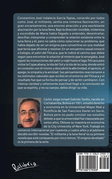 Constantino José Indalecio García Tapias, conocido por todos como José, el militante, sentía una inmensa fascinación, un gran encantamiento, una enorme atracción y una exorbitante alucinación por la luna llena. Bajo la dirección invisible, misteriosa y escondida de María había llegado a entender, desentrañar, descifrar, interpretar y comprender la relación existente entre la luna llena y él, pero no sabía cómo solucionar su problema, que había dejado de ser un enigma para convertirse en una realidad que tenía que afrontar y resolver. En un encuentro casual conoció a Eulogio, el yatiri del Titicaca, que le indicó el camino que debía seguir para encontrar la solución al misterio que le amargaba. José siguió las instrucciones del yatiri y viajó hasta el lago Titicaca para visitar la Copacabana, la isla del Sol y la isla de la Luna, donde entró en conexión con él mismo y descubrió la afectividad, el aprecio, el apego, la simpatía y la amistad. Sus pensamientos reaccionaron a los estímulos naturales que recibió en el entorno del Titicaca y el resultado fue que su forma de pensar y de sentir cambiaron. Con intensa claridad y vehemente exactitud llegó a la conclusión de que su espíritu, y no su cuerpo, debía dirigir su vida.
