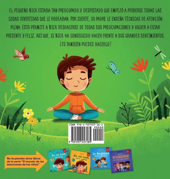 ¿¿¿ Este libro de cuentos es una edición en español de Amazon: "Mindfulness Makes Me Stronger". Mindfulness tiene grandes beneficios en la salud mental y física de los niños. Nuestro libro infantil es una excelente guía para ayudar a los niños a gestionar la calma, mantenerse enfocados, superar la ansiedad y estrés. Este libro de autoayuda sobre las emociones es una perfecta herramienta para introducir a tu pequeño en el concepto de conciencia plena aprendiendo a través de un cuento infantil. Los padres a menudo tienen dificultades para explicarles a sus hijos cómo lidiar con la distracción, la tristeza y los sentimientos de enojo. Este libro de mindfulness para niños será su mejor asistente para calmar a sus hijos y mostrarles ejercicios que los ayudarán a sentirse felices, concentrados y tranquilos. La historia de Nick relata formas de deshacerse de los pensamientos que distraen y le enseñará a su hijo a mantenerse concentrado y presente en todo momento. Cuando el pequeño Nick comienza a preocuparse por todo lo que sucede a su alrededor, su papá le enseña cómo lidiar con sus pensamientos de una manera divertida y lúdica. Mediante el uso de técnicas de respiración adaptadas a los niños y otros consejos útiles, Nick aprende a controlar sus emociones y se vuelve consciente de sí mismo, disfrutando el presente. Nuestro libro ilustrado es adecuado tanto para niños en edad preescolar como para niños de 6 años a 10 años, contiene hermosas ilustraciones dibujadas a mano y rimas encantadoras que los niños disfrutarán. La historia sobre el pequeño Nick ayudará a su hijo a:Disfrutar el presente y todo lo que le rodea. Usar sus sentidos y la meditación para deshacerte de la ansiedad. Cultivar la bondad y la empatía hacia los demás. No preocuparse por cosas que aún no han sucedido. Usar los ejercicios de mindfulness en su vida diaria para superar emociones que no son positivas. Nuestro libro en español para niños, serán un excelente apoyo para que logren entender sus emociones y sentimientos. De esta forma desarrollarán mayor inteligencia emocional. Este libro de cuentos infantiles es una continuación de las aventuras de Nick en la serie de libros "El Mundo de las Emociones de los Niños". *** Aún si lo has intentado todo, este cuento infantil será perfecto para obtener un conocimiento más profundo acerca de la ansiedad, la falta de concentración y la falta de calma en los niños y cómo ayudarlos a controlar sus emociones. Altamente recomendado para niños pequeños, niños de preescolar y de primaria. Es una excelente adición para maestros, padres, consejeros y tutores, ya que se puede usar como apoyo para educar con serenidad especial para la educación emocional y apego. ¡No lo dudes! Agrega este increíble libro a tu carrito y ¡disfrútalo!