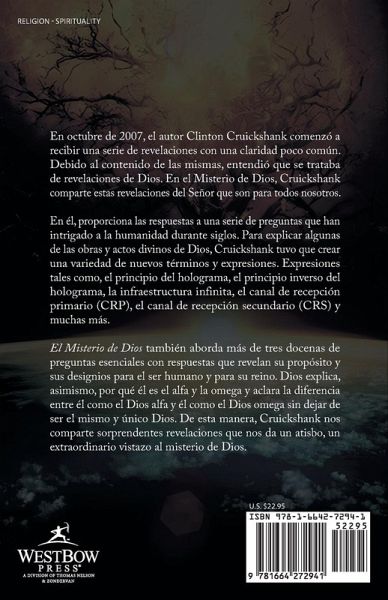 En octubre de 2007, el autor Clinton Cruickshank comenzó a recibir una serie de revelaciones con una claridad poco común. Debido al contenido de las mismas, entendió que se trataba de revelaciones de Dios. En el Misterio de Dios, Cruickshank comparte estas revelaciones del Señor que son para todos nosotros. En él, proporciona las respuestas a una serie de preguntas que han intrigado a la humanidad durante siglos. Para explicar algunas de las obras y actos divinos de Dios, Cruickshank tuvo que crear una variedad de nuevos términos y expresiones. Expresiones tales como, el principio del holograma, el principio inverso del holograma, la infraestructura infinita, el canal de recepción primario (CRP), el canal de recepción secundario (CRS) y muchas más. El Misterio de Dios también aborda más de tres docenas de preguntas esenciales con respuestas que revelan su propósito y sus designios para el ser humano y para su reino. Dios explica, asimismo, por qué él es el alfa y la omega y aclara la diferencia entre él como el Dios alfa y él como el Dios omega sin dejar de ser el mismo y único Dios. De esta manera, Cruickshank nos comparte sorprendentes revelaciones que nos da un atisbo, un extraordinario vistazo al misterio de Dios.