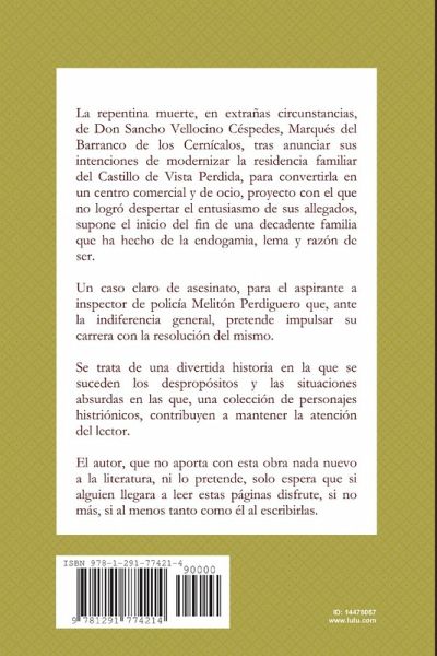 La repentina muerte, en extrañas circunstancias, de Don Sancho Vellocino Céspedes, Marqués del Barranco de los Cernícalos, tras el anuncio de modernizar la residencia familiar del Castillo de Vista Perdida para convertirla en un centro comercial y de ocio, proyecto con el que no logró despertar el entusiasmo de sus allegados, supone el inicio del fin de una decadente familia que ha hecho de la endogamia, lema y razón de ser. Un caso claro de asesinato, para el aspirante a inspector de policía Melitón Perdiguero que, ante la indiferencia general, pretende impulsar su carrera con la resolución del mismo. Se trata de una divertida historia en la que se suceden los despropósitos y las situaciones absurdas en las que, una colección de personajes histriónicos, contribuyen a mantener la atención del lector. El autor, que no aporta con esta obra nada nuevo a la literatura, ni lo pretende, solo espera que si alguien llegara a leer estas páginas disfrute, si no más, si al menos tanto como él al escribirlas.