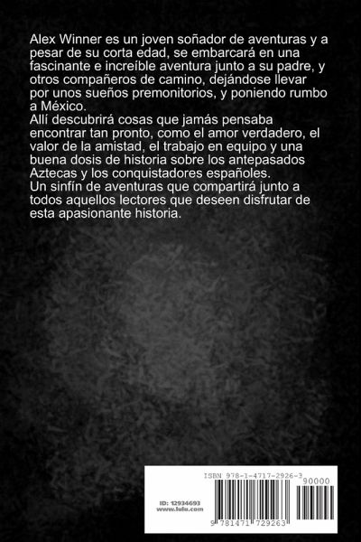 Alex Winner es un joven soñador de aventuras y a pesar de su corta edad, se embarcará en una fascinante e increíble aventura junto a su padre, y otros compañeros de camino, dejándose llevar por unos sueños premonitorios, y poniendo rumbo a México. Allí descubrirá cosas que jamás pensaba encontrar tan pronto, como el amor verdadero, el valor de la amistad, el trabajo en equipo y una buena dosis de historia sobre los antepasados Aztecas y los conquistadores españoles. Un sinfín de aventuras que compartirá junto a todos aquellos lectores que deseen disfrutar de esta apasionante historia.