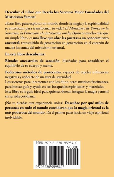 Descubre el Libro que Revela los Secretos Mejor Guardados del Misticismo Yemení ¿Estás listo para explorar un mundo donde la magia y la espiritualidad se entrelazan para transformar tu vida? El Misticismo de Yemen en la Sanación, la Protección y la Interacción con los Djinn es mucho más que un simple libro: es una llave que abre las puertas a un conocimiento ancestral, transmitido de generación en generación en el corazón de una de las cunas del misticismo oriental. En este libro descubrirás: Rituales ancestrales de sanación, diseñados para restablecer el equilibrio de tu cuerpo y mente. Poderosos métodos de protección, capaces de repeler influencias negativas y rodearte de un aura de serenidad. Los secretos para interactuar con los djinn, seres místicos fascinantes, para buscar guía y ayuda en tus búsquedas espirituales y materiales. Este libro es la guía ideal para quienes desean integrar la magia yemení en su vida cotidiana. ¡No te pierdas esta experiencia única! Descubre por qué miles de personas en todo el mundo consideran que la magia oriental es la más poderosa del mundo. Da el primer paso hacia un viaje espiritual inolvidable.