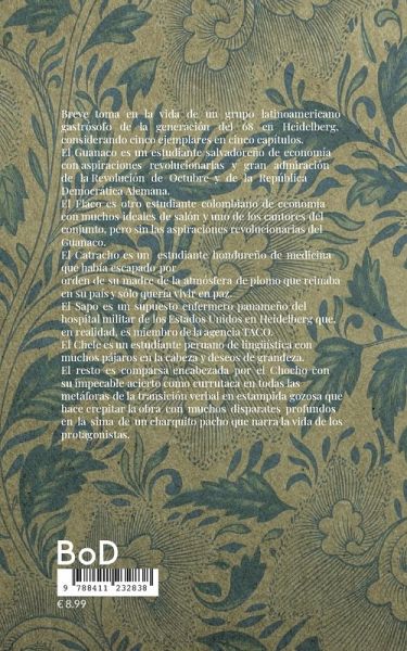 Breve toma en la vida de un grupo latinoamericano gastrósofo de la generación del 68 en Heidelberg, considerando cinco ejemplares en cinco capítulos. El Guanaco es un estudiante salvadoreño de economía con aspiraciones revolucionarias y gran admiración de la Revolución de Octubre y de la República Democrática Alemana. El Flaco es otro estudiante colombiano de economía con muchos ideales de salón y uno de los cantores del conjunto, pero sin las aspiraciones revolucionarias del Guanaco. El Catracho es un estudiante hondureño de medicina que había escapado por orden de su madre de la atmósfera de plomo que reinaba en su país y sólo quería vivir en paz. El Sapo es un supuesto enfermero panameño del hospital militar de los Estados Unidos en Heidelberg que, en realidad, es miembro de la agencia TACO. El Chele es un estudiante peruano de lingüística con muchos pájaros en la cabeza y deseos de grandeza. El resto es comparsa encabezada por el Chocho con su impecable acierto como currutaca en todas las metáforas de la transición verbal en estampida gozosa que hace crepitar la obra con muchos disparates profundos en la sima de un charquito pacho que narra la vida de los protagonistas.