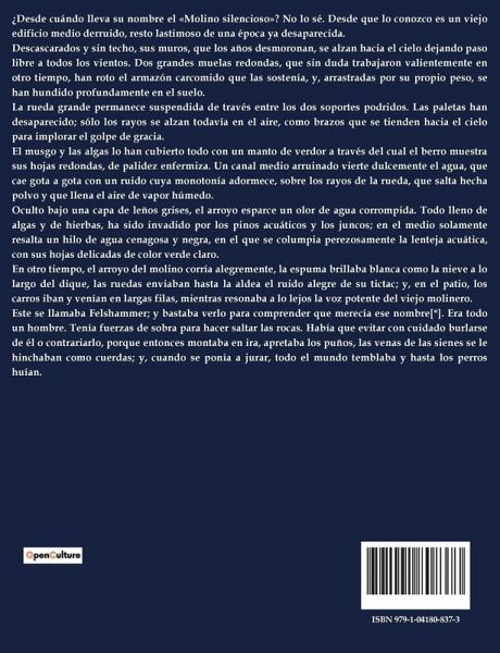 ¿Desde cuándo lleva su nombre el «Molino silencioso»? No lo sé. Desde que lo conozco es un viejo edificio medio derruido, resto lastimoso de una época ya desaparecida. Descascarados y sin techo, sus muros, que los años desmoronan, se alzan hacia el cielo dejando paso libre a todos los vientos. Dos grandes muelas redondas, que sin duda trabajaron valientemente en otro tiempo, han roto el armazón carcomido que las sostenía, y, arrastradas por su propio peso, se han hundido profundamente en el suelo. La rueda grande permanece suspendida de través entre los dos soportes podridos. Las paletas han desaparecido; sólo los rayos se alzan todavía en el aire, como brazos que se tienden hacia el cielo para implorar el golpe de gracia. El musgo y las algas lo han cubierto todo con un manto de verdor a través del cual el berro muestra sus hojas redondas, de palidez enfermiza. Un canal medio arruinado vierte dulcemente el agua, que cae gota a gota con un ruido cuya monotonía adormece, sobre los rayos de la rueda, que salta hecha polvo y que llena el aire de vapor húmedo. Oculto bajo una capa de leños grises, el arroyo esparce un olor de agua corrompida. Todo lleno de algas y de hierbas, ha sido invadido por los pinos acuáticos y los juncos; en el medio solamente resalta un hilo de agua cenagosa y negra, en el que se columpia perezosamente la lenteja acuática, con sus hojas delicadas de color verde claro. En otro tiempo, el arroyo del molino corría alegremente, la espuma brillaba blanca como la nieve a lo largo del dique, las ruedas enviaban hasta la aldea el ruido alegre de su tictac; y, en el patio, los carros iban y venían en largas filas, mientras resonaba a lo lejos la voz potente del viejo molinero. Este se llamaba Felshammer; y bastaba verlo para comprender que merecía ese nombre[*]. Era todo un hombre. Tenía fuerzas de sobra para hacer saltar las rocas. Había que evitar con cuidado burlarse de él o contrariarlo, porque entonces montaba en ira, apretaba los puños, las venas de las sienes se le hinchaban como cuerdas; y, cuando se ponía a jurar, todo el mundo temblaba y hasta los perros huían.