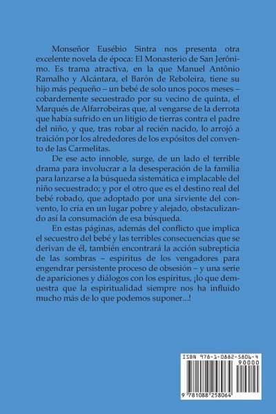 Monseñor Eusébio Sintra nos presenta otra excelente novela de época: El Monasterio de San Jerônimo. Es trama atractiva, en la que Manuel Antônio Ramalho y Alcántara, el Barón de Reboleira, tiene su hijo más pequeño - un bebé de solo unos pocos meses - cobardemente secuestrado por su vecino de quinta, el Marqués de Alfarrobeiras que, al vengarse de la derrota que había sufrido en un litigio de tierras contra el padre del niño, y que, tras robar al recién nacido, lo arrojó a traición por los alrededores de los expósitos del convento de las Carmelitas. De ese acto innoble, surge, de un lado el terrible drama para involucrar a la desesperación de la familia para lanzarse a la búsqueda sistemática e implacable del niño secuestrado; y por el otro que es el destino real del bebé robado, que adoptado por una sirviente del convento, lo cría en un lugar pobre y alejado, obstaculizando así la consumación de esa búsqueda. En estas páginas, además del conflicto que implica el secuestro del bebé y las terribles consecuencias que se derivan de él, también encontrará la acción subrepticia de las sombras - espíritus de los vengadores para engendrar persistente proceso de obsesión - y una serie de apariciones y diálogos con los espíritus, ¡lo que demuestra que la espiritualidad siempre nos ha influido mucho más de lo que podemos suponer...!