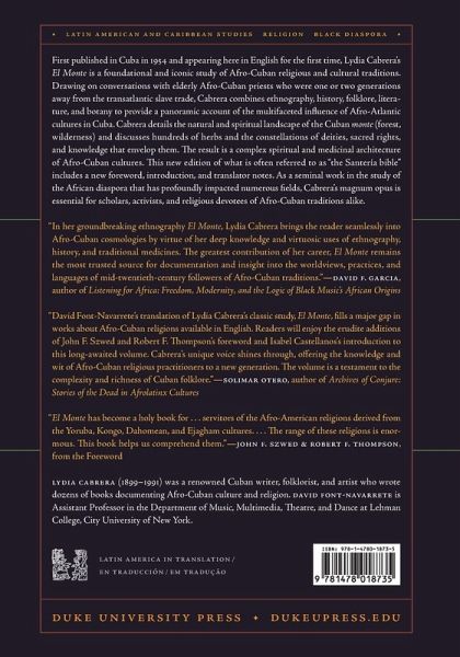 First published in Cuba in 1954 and appearing here in English for the first time, Lydia Cabrera's El Monte is a foundational and iconic study of Afro-Cuban religious and cultural traditions. Drawing on conversations with elderly Afro-Cuban priests who were one or two generations away from the transatlantic slave trade, Cabrera combines ethnography, history, folklore, literature, and botany to provide a panoramic account of the multifaceted influence of Afro-Atlantic cultures in Cuba. Cabrera details the natural and spiritual landscape of the Cuban monte (forest, wilderness) and discusses hundreds of herbs and the constellations of deities, sacred rites, and knowledge that envelop them. The result is a complex spiritual and medicinal architecture of Afro-Cuban cultures. This new edition of what is often referred to as "the Santería bible" includes a new foreword, introduction, and translator notes. As a seminal work in the study of the African diaspora that has profoundly impacted numerous fields, Cabrera's magnum opus is essential for scholars, activists, and religious devotees of Afro-Cuban traditions alike.