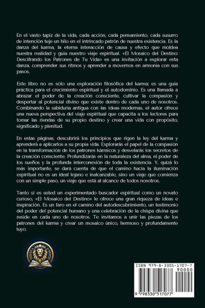 En el vasto tapiz de la vida, cada acción, cada pensamiento, cada susurro de intención teje un hilo en el intrincado patrón de nuestra existencia. Es la danza del karma, la eterna interacción de causa y efecto que moldea nuestra realidad y guía nuestro viaje espiritual. El Mosaico del Destino: Descifrando los Patrones de Tu Vida es una invitación a explorar esta danza, comprender sus ritmos y aprender a movernos en armonía con sus pasos. Este libro no es sólo una exploración filosófica del karma; es una guía práctica para el crecimiento espiritual y el autodominio. Es una llamada a abrazar el poder de la creación consciente, cultivar la compasión y despertar al potencial divino que existe dentro de cada uno de nosotros. Combinando la sabiduría antigua con las ideas modernas, el autor ofrece una nueva perspectiva del viaje espiritual que capacita a los lectores para tomar las riendas de su propio destino y crear una vida con propósito, significado y plenitud. En estas páginas, descubrirá los principios que rigen la ley del karma y aprenderá a aplicarlos a su propia vida. Explorarás el papel de la compasión en la transformación de los patrones kármicos y desvelarás los secretos de la creación consciente. Profundizarás en la naturaleza del alma, el poder de los sueños y la profunda interconexión de toda la existencia. Y, quizá lo más importante, se dará cuenta de que el camino hacia la iluminación espiritual no es un ideal lejano e inalcanzable, sino un viaje que comienza con un simple paso, un viaje que está al alcance de todos nosotros. Tanto si es usted un experimentado buscador espiritual como un novato curioso, El Mosaico del Destino le ofrece una gran riqueza de ideas e inspiración. Es un faro en el camino del autodescubrimiento, un testimonio del poder del potencial humano y una celebración de la chispa divina que reside en cada uno de nosotros. Te invitamos a unir las piezas de los patrones del karma y crear un mosaico único, hermoso y profundamente tuyo.