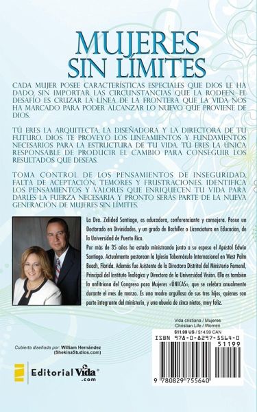Every woman possesses special characteristics that God has given her; in spite of the circumstances that surrounds her. The challenge is to cross the borderline that life has demarked us with in order to reach the new things that come from God.You are the architect, the designer and the director of your future. God has provided you with the necessary contour and foundation for the forming of your life. You are the only one responsible for producing changes in order to reach the results you want. Take control of the thoughts of insecurity, lack of acceptance, fears and frustrations. Identify the thoughts and values that enrich your life to give it the necessary strength and soon you will be part of the new generation of Women without Limits.