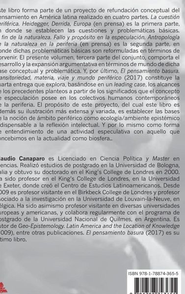 Este libro forma parte de un proyecto de refundación conceptual del pensamiento en América latina y que ha sido realizado en cuatro partes. La cuestión periférica. Heidegger, Derrida, Europa (en prensa) es la primera parte en donde se establecen las cuestiones y problemáticas básicas. El fin de la naturaleza. Fallo y propósito en la especulación. Antropología de la naturaleza en la periferia (en prensa) es la segunda parte en donde dichas problemáticas básicas son reformuladas en términos de porvenir. El presente volumen, tercera parte del conjunto, es el desarrollo y expansión argumentativa en términos de mundo de dicha base conceptual y problemática. Y, por último, El pensamiento basura. Transitoriedad, materia, viaje y mundo periférico (2017) constituye la cuarta entrega que explora, basándose en un leading case , los alcances de los precedentes planteos a partir de los significados que el concepto de especulación posee en los colectivos humanos contemporáneos de la periferia.El propósito de este proyecto, del cual además este libro es su ilustración más extensa y variada, es establecer las bases de la noción de ámbito periférico como ecología/ambiente epistémico indispensable a la reflexión intelectual. Y por lo mismo como forma de entendimiento de lo especulativo con lo biosférico.